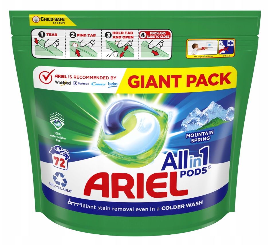 NAUDOJIMAS: sausomis rankomis įdėkite kapsulę į skalbimo mašinos būgną prieš sudedant drabužius (žr. į dozavimo lentelę ant produkto pakuotės). Dėl vandens kietumo jūsų vietovėje teiraukitės paslaugos teikėjo. Per didelė dozė neišvalo geriau drabužių, bet yra kenksminga aplinkai. Sumažinkite įprastų skalbimo programų temperatūrą, kad labiau saugotumėte aplinką. Jei esate alergiški dulkėms, visada skalbkite patalynę 60°C arba aukštesnėje temperatūroje. Nenaudokite greito skalbimo programos. Nenuimkite kapsulę dengiančios plėvelės. Netinka skalbimui rankomis.