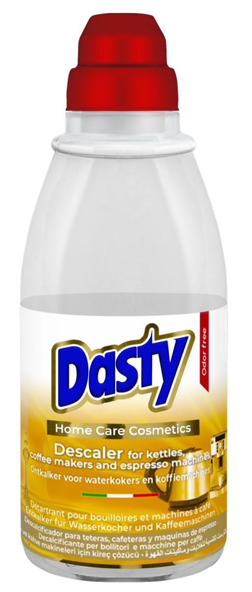 NAUDOJIMAS: virdulys – į bakelį įpilkite 75 ml (pusę arbatos puodelio) priemonės, palikite 5 min. ir papildykite vandeniu, kol pasieksite 0,5 l tirpalo tūrį. Palikite veikti 20 min. Išpilkite ir gerai išskalaukite. Kavos aparatai – į bakelį įpilkite 75 ml (pusę arbatos puodelio) priemonės ir papildykite vandeniu, kol pasieksite 0,5 l tirpalo tūrį. Išleiskite 2 puodelius karšto vandens arba garų, išjunkite aparatą ir palikite 20 minučių. Kartokite šiuos veiksmus, kol bakelis bus tuščias. Išplaukite bakelį, pripildykite jį švariu vandeniu ir išleiskite visą turinį, kad prietaisas būtų visiškai išskalautas. Lygintuvai – į rezervuarą, pripildytą vandens, įpilkite 50 ml produkto ir įjunkite lyginimo garais funkciją. Palaipsniui paleiskite garus (naudokite garų mygtuką), kad tirpalas pratekėtų per garų kanalus. Išjunkite ir palikite likusį tirpalą viduje 15-20 minučių. Po valymo ištuštinkite talpą, kelis kartus praplaukite švariu vandeniu ir vėl paleiskite garų funkciją su švariu vandeniu, kad prietaisas būtų visiškai išskalautas. Skalbimo mašinos – įpilkite 200-250 ml DASTY nukalkinimo priemonės tiesiai į būgną (ne ploviklių stalčių). Nustatykite karštą skalbimo ciklą (be drabužių) - rekomenduojama 60°C ar aukštesnė temperatūra. Paleiskite visą ciklą. Baigus ciklą, galite dar kartą paleisti trumpą skalavimo programą, kad užtikrintumėte visišką likučių pašalinimą. Patarimas: tokį skalbimo mašinos nukalkinimą rekomenduojama atlikti kas 1-3 mėnesius, priklausomai nuo vandens kietumo.