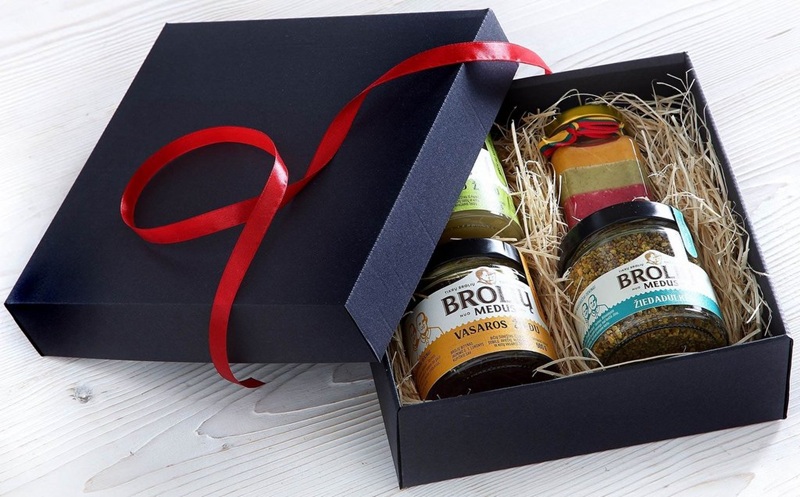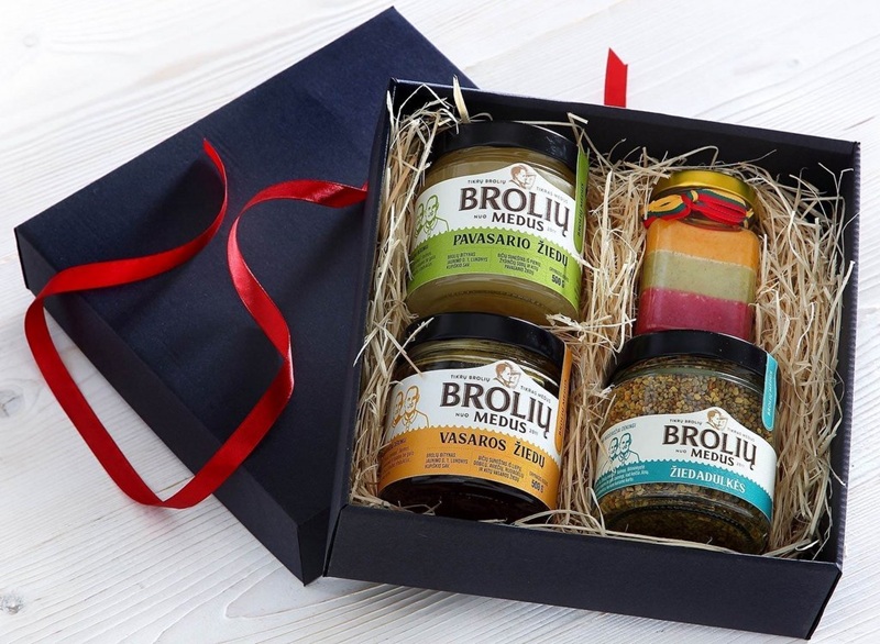 - visi bičių produktai gražiai supakuoti į elegantišką dėžutę.